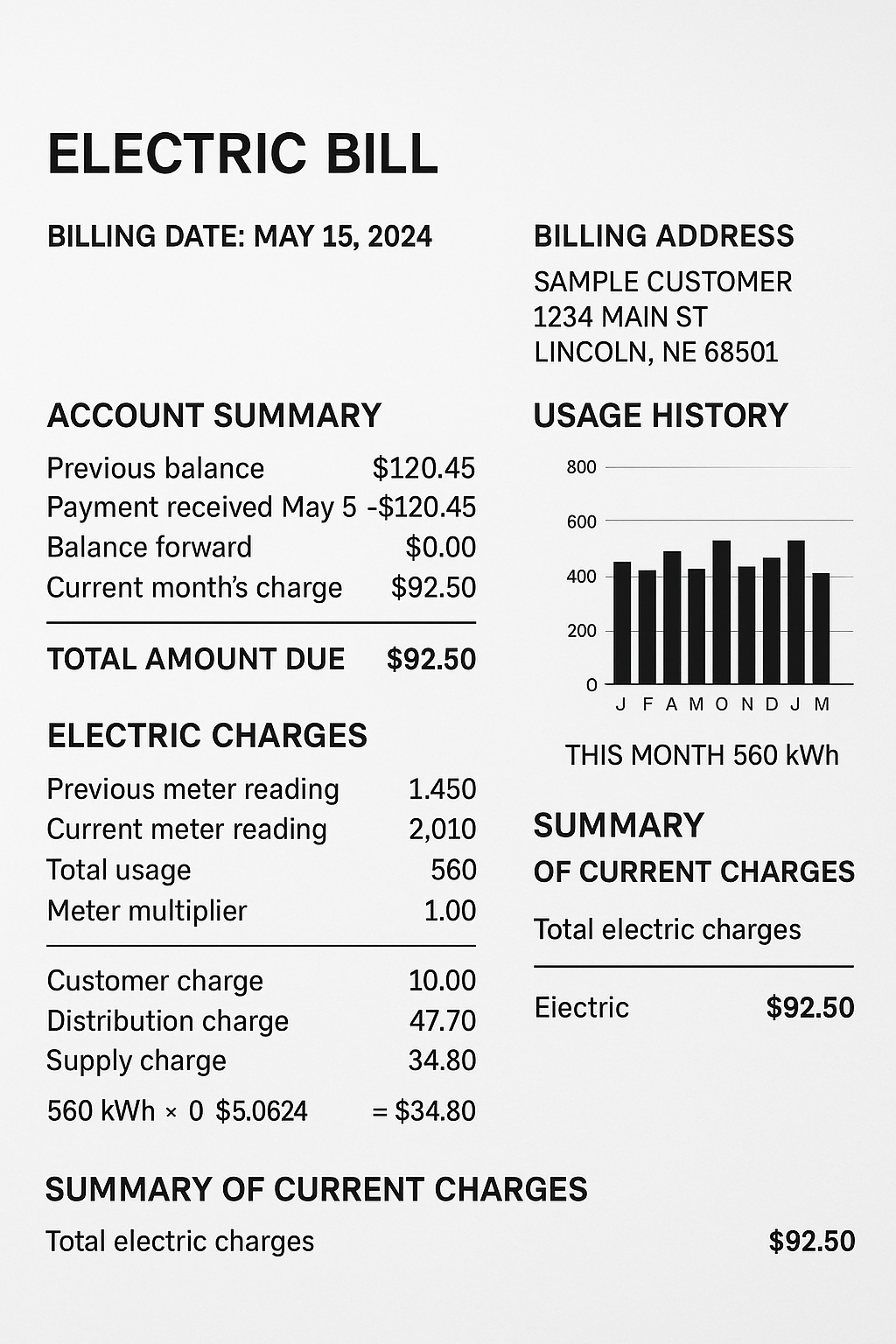 Although the layout varies by utility company, most Nebraska electrical bills include similar sections. Here’s what each one means: